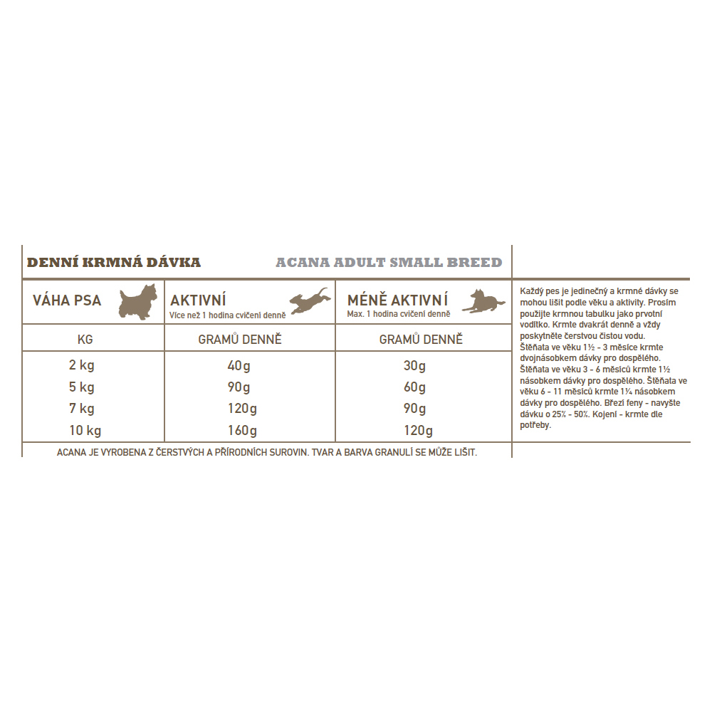 PRO PSY MALÝCH PLEMEN OD JEDNOHO ROKU PŘIPRAVOVÁNO V NAŠICH OCEŇOVANÝCH KUCHYNÍCH V KANADĚ. ACANA ADULT SMALL BREED PŘEKYPUJE ČERSTVÝMI MÍSTNÍMI SUROVINAMI VČETNĚ VOLNĚ CHOVANÝCH KUŘAT, VAJEC Z HNÍZDNÍCH CHOVŮ, PLATÝSE LOVENÉHO VOLNĚ V PŘÍRODĚ A NA SLUNCI ZRAJÍCÍHO OVOCE A ZELENINY – VŠECHNY SUROVINY DODÁVAJÍ VÝŽIVU A CHUTNOST A ZAJIŠŤUJÍ TAK VRCHOLOVOU KONDICI PSŮ MALÝCH PLEMEN. PŘEČTĚTE SI NAŠE SLOŽENÍ A MYSLÍME, ŽE S NÁMI BUDETE SOUHLASIT. Bezobilné krmivo je určeno pro dospělé psy miniaturních a malých plemen. SLOŽENÍ: Čerstvé kuřecí maso (16 %), dehydrované kuře (15 %), celá červená čočka, celý zelený hrách, celá cizrna, dehydrovaná krůta (4,5 %), kuřecí tuk (4 %), čerstvé kuřecí droby (játra, srdce) (4 %), dehydrovaný sleď (4 %), vejce (4 %), syrový platýs (4 %), rybí olej (4 %), celá zelená čočka, celý žlutý hrách, vláknina z hrášku, hráškový škrob, syrová krůtí játra (0,5 %), sůl, sušená řasa, celá čerstvá dýně, čerstvá celá máslová dýně, čerstvá celá mrkev, celá čerstvá jablka , čerstvé celé hrušky, čerstvá celá cuketa, sušený kořen čekanky, čerstvá kapusta, čerstvý špenát, čerstvé listy tuřínu, čerstvé listy červené řepy, čerstvé brusinky, čerstvé celé borůvky, čerstvý celý muchovník olšolistý, kurkuma, ostropestřec, kořen lopuchu, levandule, kořen ibišku, šípky. Doplňky (na kg) Technologické doplňky: Extrakt tokoferolu z rostlinných olejů: 121 mg, kyselina citronová: 40 mg. Smyslové doplňky: extrakt z rozmarýnu: 80 mg. Výživové doplňky: 3a890 Cholin chlorid (cholin): 700 mg, 3b606 (Zinek: 75 mg), 3b406 (Měď : 11 mg), 3a821 Vitamin B1: 25mg, 3a841 Vitamin B5: 8mg, 3a831 Vitamin B6 : 7,5mg, 3a672a Vitamin A : 1875 IU, 3a671 Vitamin D3 : 250 IU, 3a700 Vitamin E: 115 IU. Zootechnické doplňky: 4b1707 Enterococcus faecium NCIMB 10415 2,2x10 6 CFU. OBSAH KALORIÍ (vypočítaný): Vstřebatelná energie je 3510 kcal/kg (421kcal na odměrku (120g). Kalorie k podpoře špičkové kondice jsou dodávány: 31 % z bílkovin, 28 % ze sacharidů a 41 % z tuků.