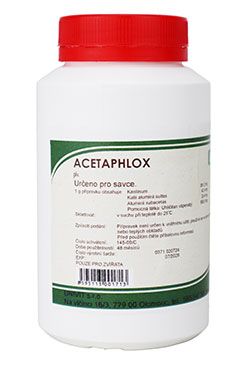 ACETAPHLOX plv. je schválený veterinární přípravek. Prášek se používá k přípravě obkladu. Obklad potlačuje zánětlivé procesy v postižené tkáni, pomáhá vstřebat otok. pomáhá všude tam, kde probíhá nějaký zánětlivý proces. Lze jej použít jako podpůrný prostředek při léčbě pohmožděnin, hematomů, zánětů kloubů, šlach, svalů a také po bodnutí hmyzem. Použití:Lze jej použít jako podpůrný prostředek při léčbě pohmožděnin, hematomů, zánětů kloubů, šlach, svalů a také po bodnutí hmyzem. Dávkování: Prášek se rozmíchá ve vodě do konzistence husté kaše a nanese v dostatečné vrstvě na postižené místo. Při akutních zánětlivých procesech se připravuje studený obklad, při chronických zánětlivých procesech se používá horký obklad (kataplazma), zahřátý na žádanou teplotu. Kataplazma je vhodné přikládat v plátěném sáčku. Složení: Kaolin 381,2 g/kg, Síran hlinito-draselný 42,4 g/kg, Octan hlinitý 20,4 g/kg, Uhličitan vápenatý 556 g/ kg
