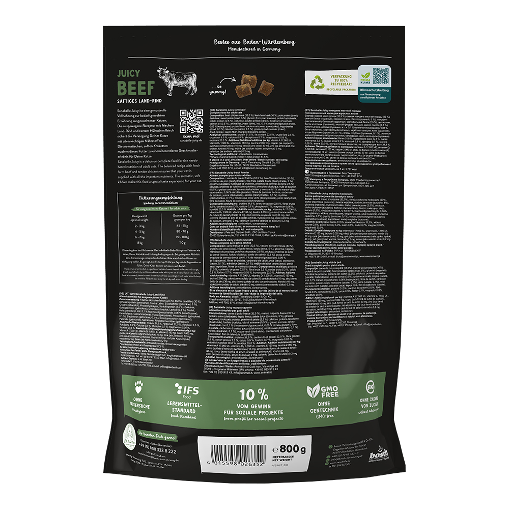 Co vaše kočka opravdu chce? Maso, maso, maso! A toho je zde spousta: vysoký podíl čerstvého hovězího masa z venkovského chovu dává tomuto krmivu nejen jeho nezaměnitelnou intenzivní, masovou chuť, ale také poskytuje cenné, snadno stravitelné bílkoviny pro energii, sílu a zdravé svaly. V kombinaci s velkým množstvím čerstvého, jemného kuřecího masa se každé jídlo stává hostinou pro skutečné masožravce. ---