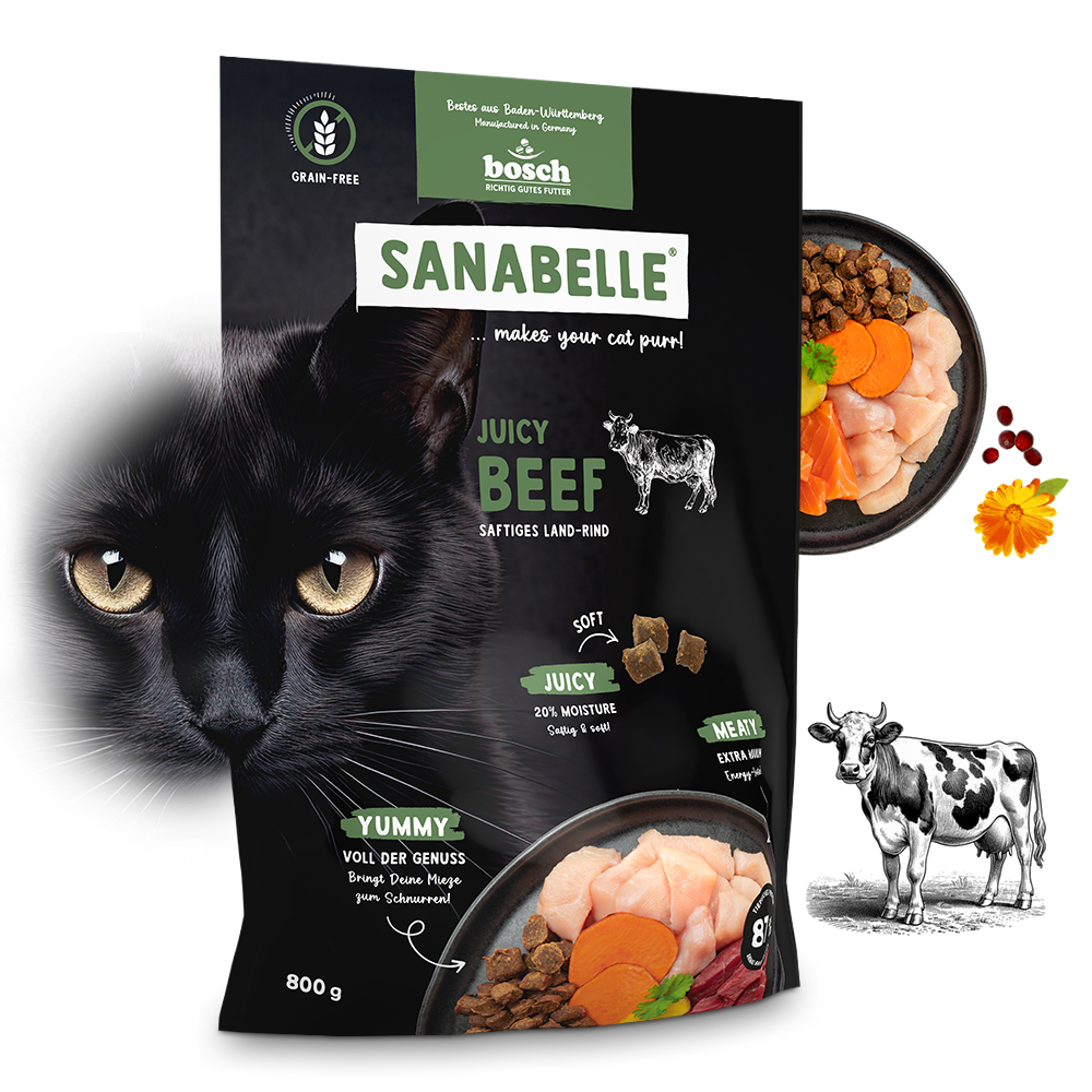 Pro skutečné milovníky masa mezi sametovými tlapkami: Sanabelle Juicy s šťavnatým hovězím masem z venkovského chovu přináší extra porci rozmanitosti a potěšení do misky – den co den. Měkké, aromatické a voňavé granule kombinují obzvláště velké množství čerstvého hovězího masa z venkovského chovu s jemným kuřecím masem a přimějí k vrnění radostí i ty nejvybíravější kočky. S extrémně vysokým podílem živočišných bílkovin (87 % celkových bílkovin) je toto bezobilné kompletní krmivo nejen neuvěřitelně chutné, ale také obzvláště bohaté na živiny – ideální pro aktivní kočky s vytříbeným vkusem a velkým apetitem. ---