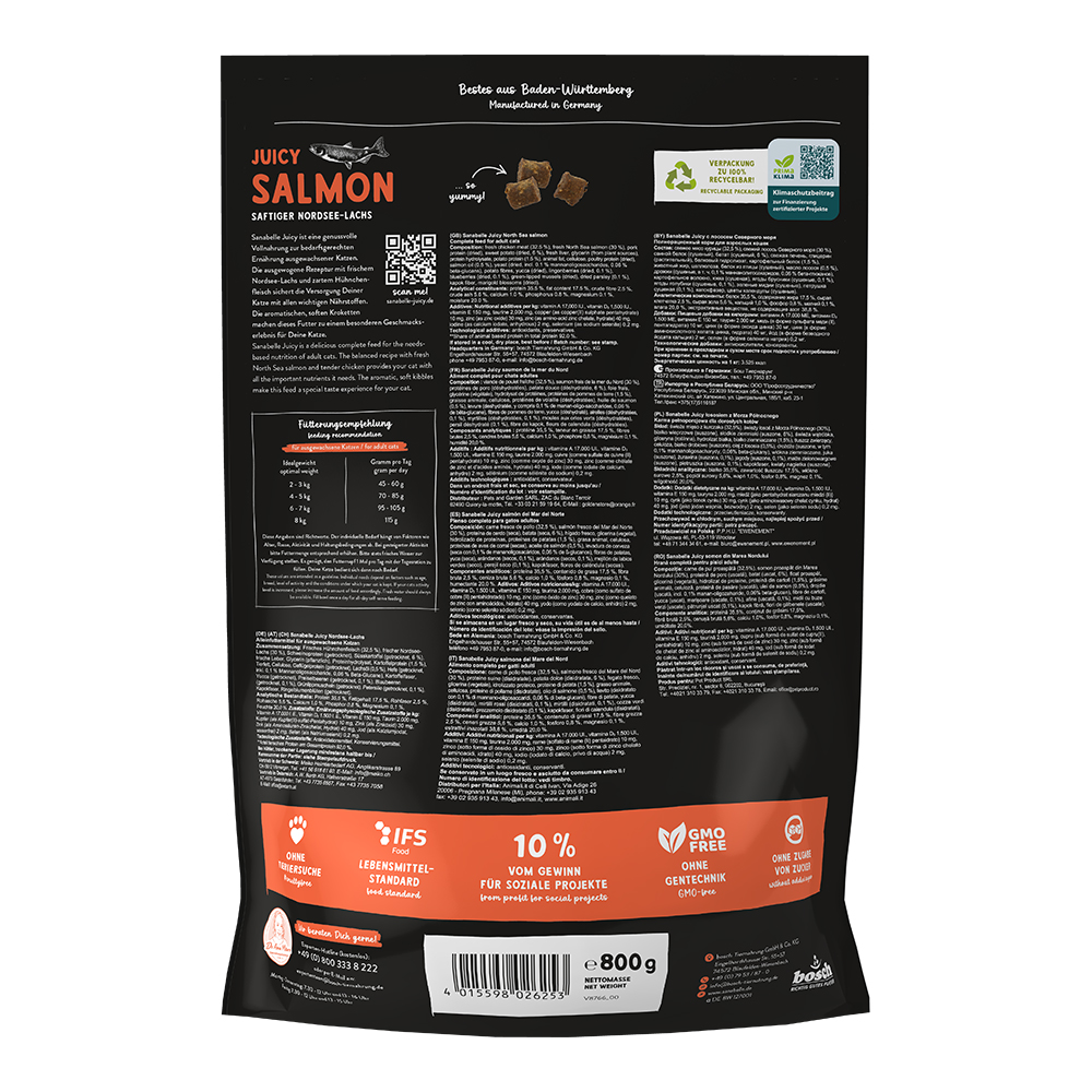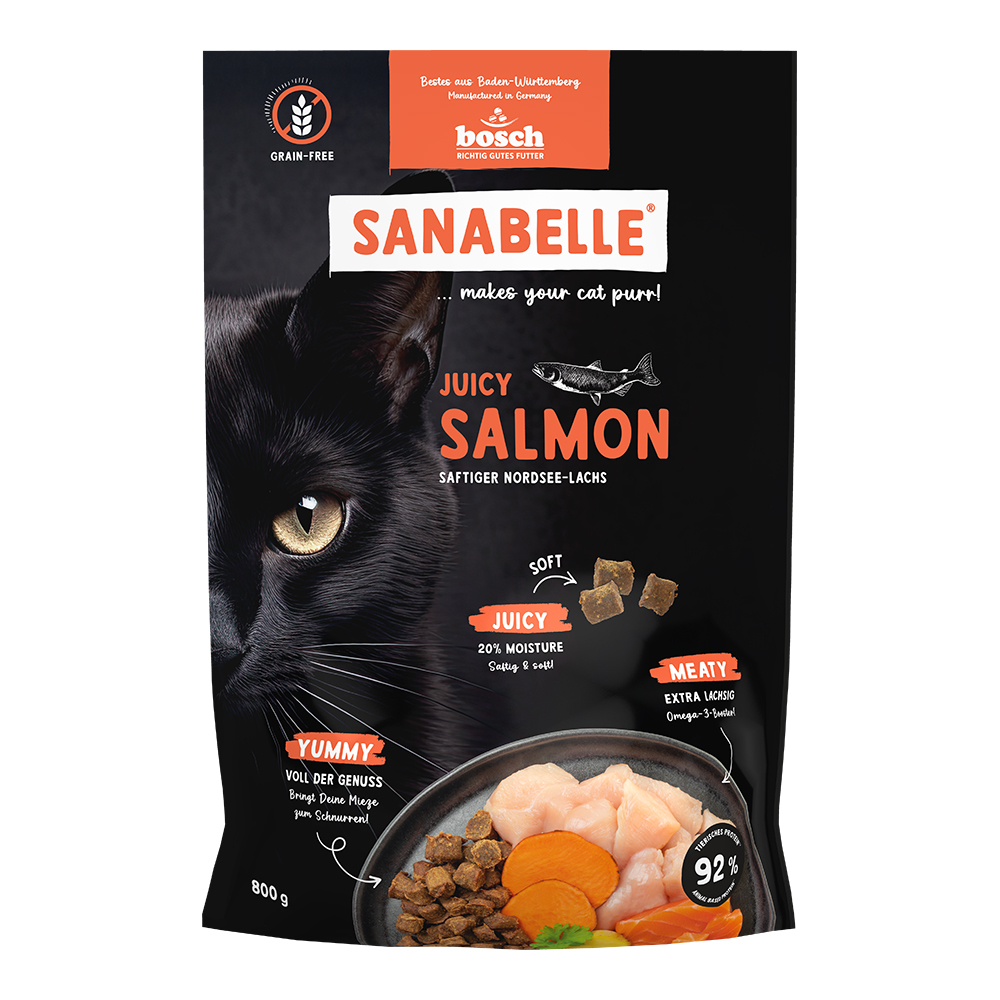 Pokud jídlo voní lákavě hned po otevření a vaše kočka čeká před miskou s nastraženýma ušima, pak je čas na Sanabelle Juicy North Sea Salmon. Tato výjimečná receptura kombinuje čerstvého severomořského lososa s jemným kuřecím masem – pro chuťový zážitek, který vaši kočku nejen nasytí, ale také ji prokazatelně potěší. S 92 % živočišných bílkovin z celkového proteinu je každá porce plná vysoce kvalitních zdrojů bílkovin – snadno stravitelných, s výrazným účinkem. Pro všechny, kteří chtějí svou rybí milovnici s sametovými tlapkami rozmazlovat po všech stránkách. ---
