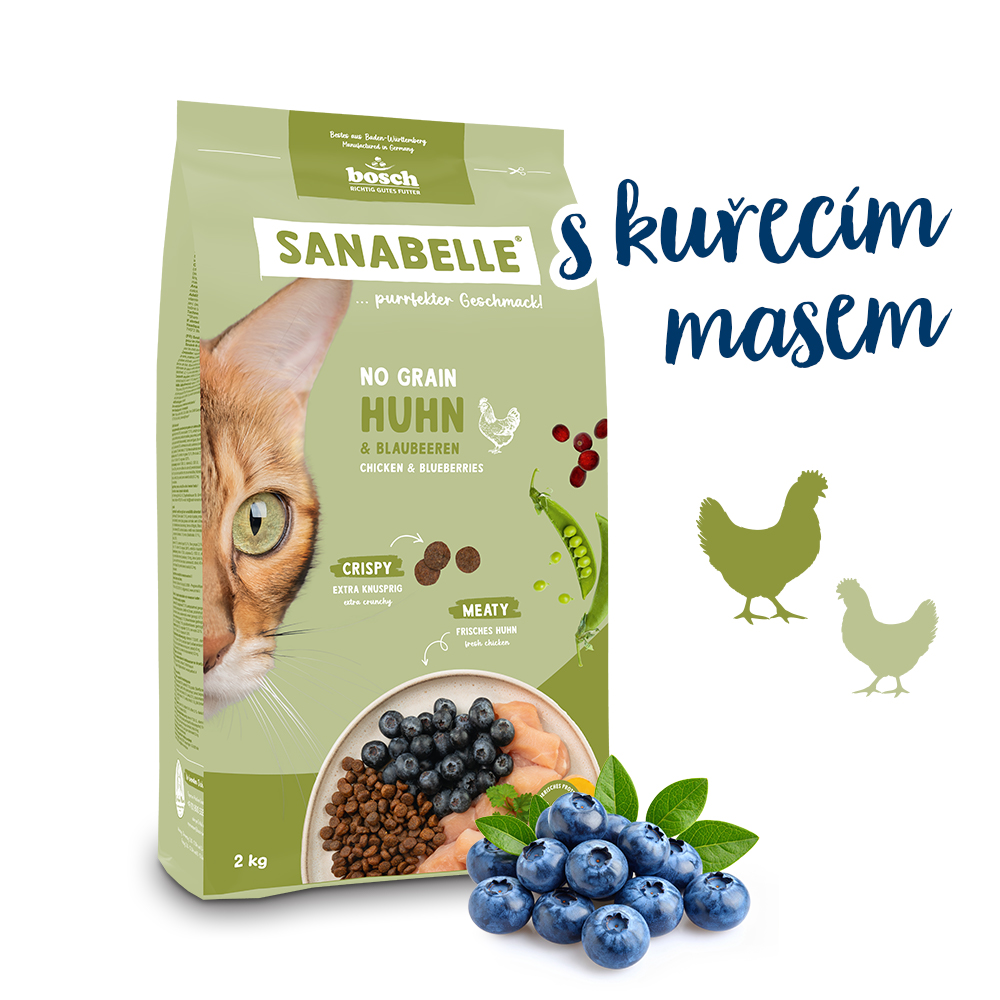 Sanabelle No Grain s kuřecím masem a borůvkami je ideální volbou pro všechny dospělé, nutričně citlivé kočky od 12 měsíců věku – zejména pro zvířata se známou nebo podezřelou intolerancí obilovin. Receptura je zcela bez obilovin a místo toho používá vysoce stravitelné brambory jako alternativní zdroj sacharidů. Lahodně křupavé menu pro citlivé gurmány s vysokými nároky: vysoce kvalitní, bezobilné krmivo plné chuti a vynikající stravitelnosti. ---