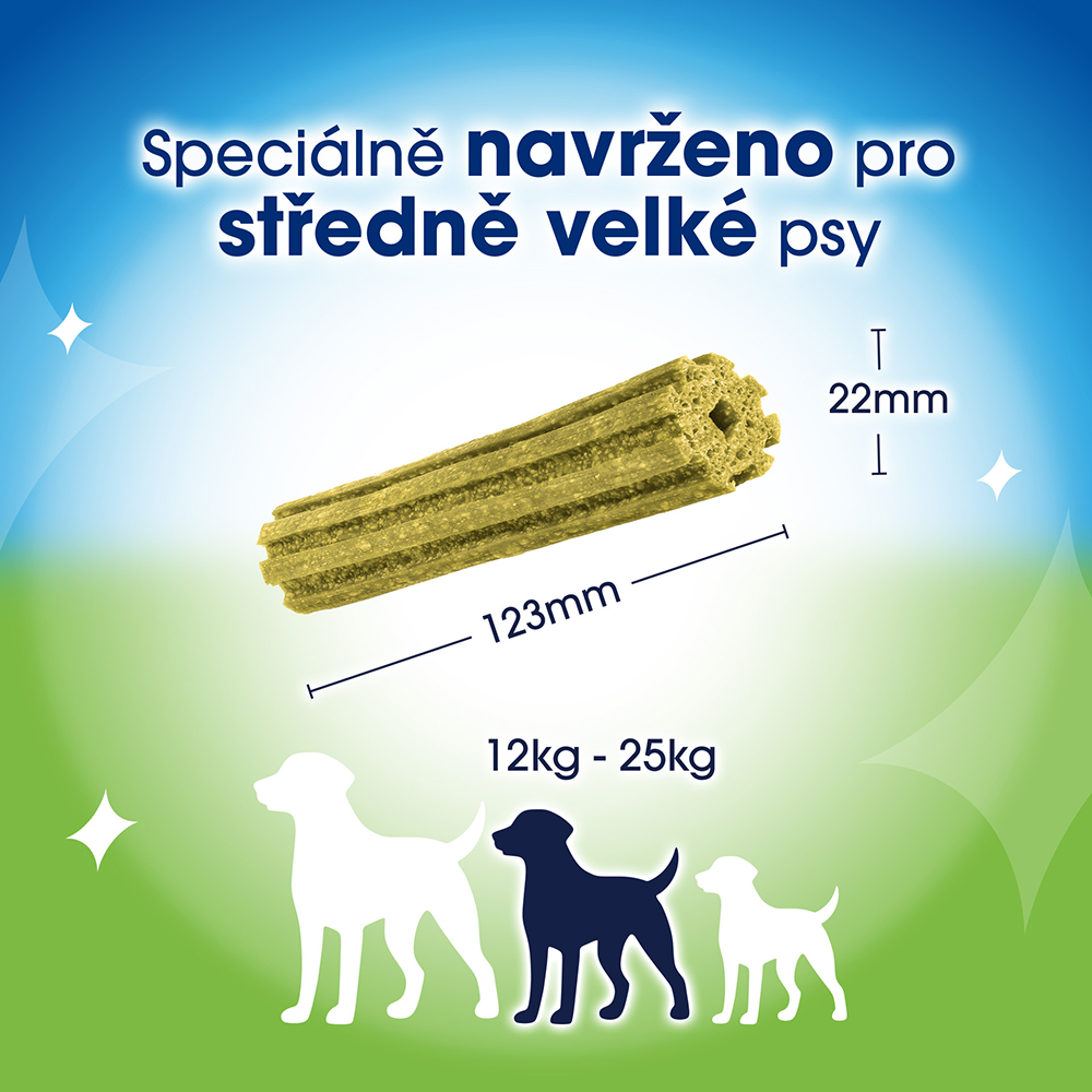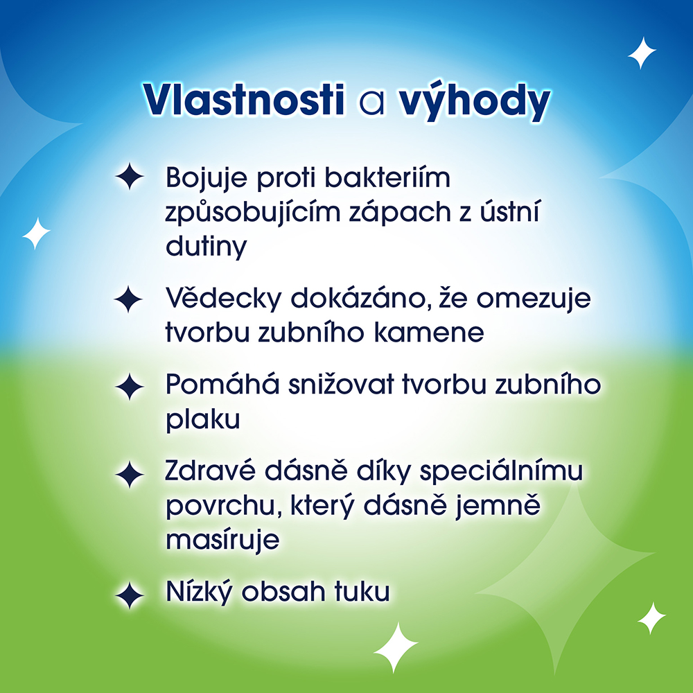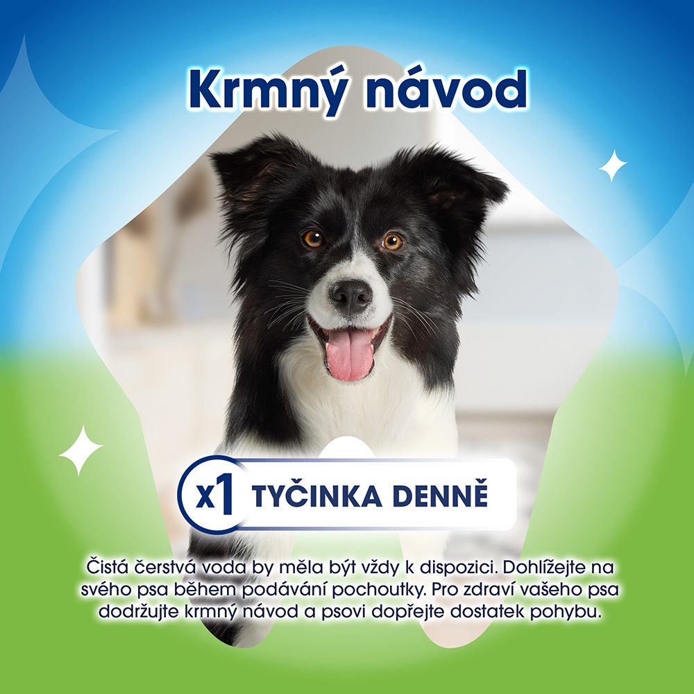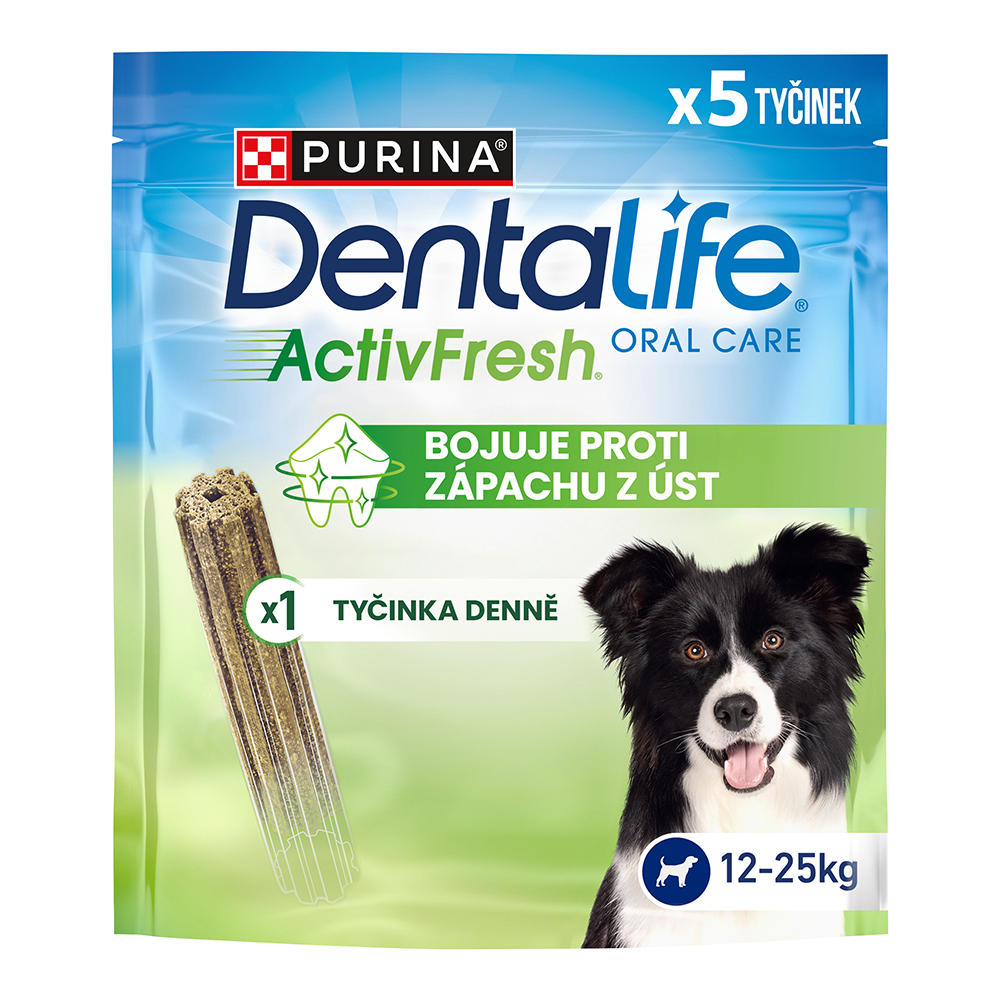 Žvýkací pochoutka pro psy Místo pouhého zakrývání zápachu z úst je Purina® Dentalife® ActivFresh®, obsahující přírodní spirulinu a med, navržena tak, aby neutralizovala bakterie, které jsou příčinnou zápachu z úst. ActivFresh® má stejný tvar, velikost a měkčí texturu šetrnou k dásním jako Dentalife®. Vědecky dokázáno, že omezuje tvorbu zubního kamene. Bojuje s bakteriemi způsobujícími zápach z úst. Pomáhá omezovat tvorbu zubního plaku. Přirozený způsob čištění zubů. Vědecky dokázáno, že díky svému tvaru, velikosti a struktuře omezuje tvorbu zubního kamene a čistí i těžko dostupné zuby. Chutná pochoutka - s nízkým obsahem tuku. Vyrobeno z přírodních surovin* a bez přidaných umělých barviv. Složení: Obiloviny*, glycerol, minerální látky, vedlejší výrobky rostlinného původu, med (1,4 %), oleje a tuky, maso a výrobky živočišného původu, spirulina* (0,21 %), *Přírodní suroviny Doplňkové látky: Nutriční doplňkové látky:: m.j./kg:, vit A:: 8500, vit D3:: 570, vit E:: 62, mg/kg:, vitamíny skupiny B:: 54, jodičnan vápenatý bezvodý: (I:) : 1,4, síran manganatý monohydrát: (Mn:): 4,0, síran zinečnatý monohydrát: (Zn:): 100, seleničitan sodný: (Se:): 0,14, Antioxidanty, Barviva, Analytické složky: protein:: 5,5 %, obsah tuku:: 2,5 %, obsah anorganických látek:: 5,0 %, hrubá vláknina:: 1,5 %, vlhkost:: 14,5 %