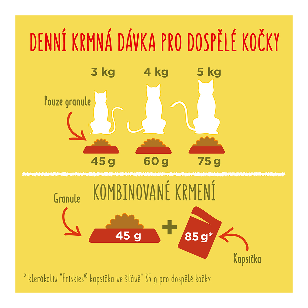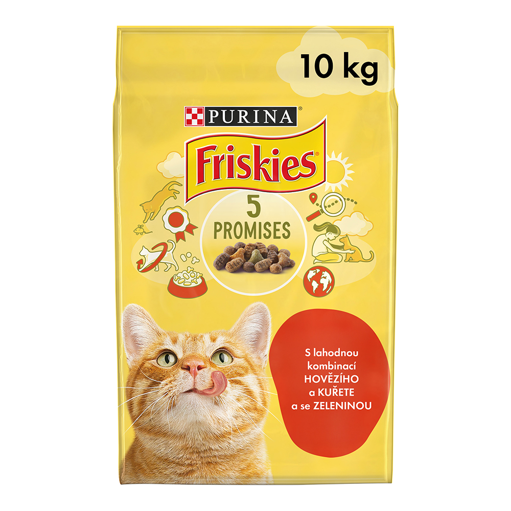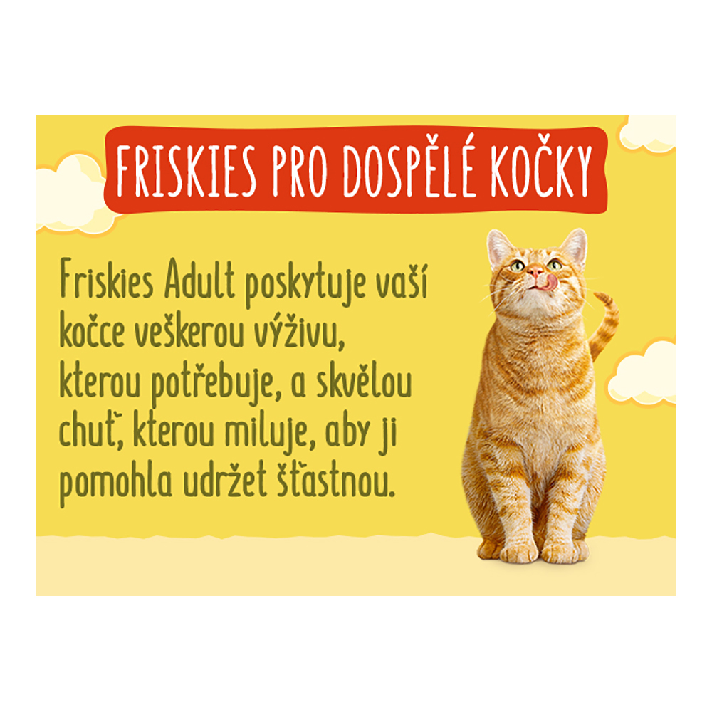Friskies® Adult poskytuje vaší kočce veškerou výživu, kterou potřebuje, a skvělou chuť, kterou miluje, aby ji pomohla udržet šťastnou. Friskies® 5 slibů Ode dne, kdy jste si pořídili kočku, jste se zavázali. Dali jste slib, že o ni budete pečovat, správně ji krmit a umožníte jí žít šťastný život, který přinese do vašeho domova mnoho radosti. Díky několika desetiletím zkušeností a odborných znalostí, díky lahodnému a kvalitnímu krmivu přináší Friskies štěstí kočkám každý den již po celé generace. S touto ctí přichází zároveň i velká zodpovědnost. A stejně jako vy, i my ve Friskies děláme maximum pro to, co jsme si slíbili. Pro vaši kočku a pro vás. 5 slibů, protože nám záleží na: