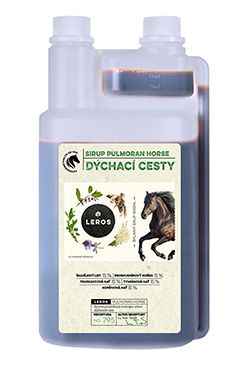 Bylinný sirup pro zdraví dýchacích cest Veterinární přípravek pro koněLeros Sirup Pulmoran Horse je bylinný sirup, který podporuje normální funkci dýchacího ústrojí koní. Byliny obsažené v sirupu napomáhají rozpouštění hlenů a odkašlávání. Použití sirupu je vhodné i pro snížení rizika výskytu onemocnění dýchacích cest.Složení: Cukr 59,21 %, vodný výluh z bylin (list šalvěje lékařské 5,92 %, kořen proskurníku 5,92 %, nať truskavce 5,92 %, nať tymiánu 5,92 %, nať kopřivy 5,92 %, plod fenyklu 3,94 %, květ černého bezu 1,97 %, list jitrocele 1,97 %, kořen lékořice 1,97 %, sorban draselný 0,49 %, benzoan sodný 0,42 %, kyselina citronová 0,39 %).Dávkování a způsob podání:Dávka 40 ml 1x denně. Dávku podávat samostatně nebo přimíchat do jadrného krmiva. Nepřekračujte uvedené dávkování.Před použitím protřepejte.Upozornění: Pouze pro zvířata. Uchovávejte při teplotě do 25 °C, v původním uzavřeném obalu. Po otevření spotřebujte do 30 dnů.