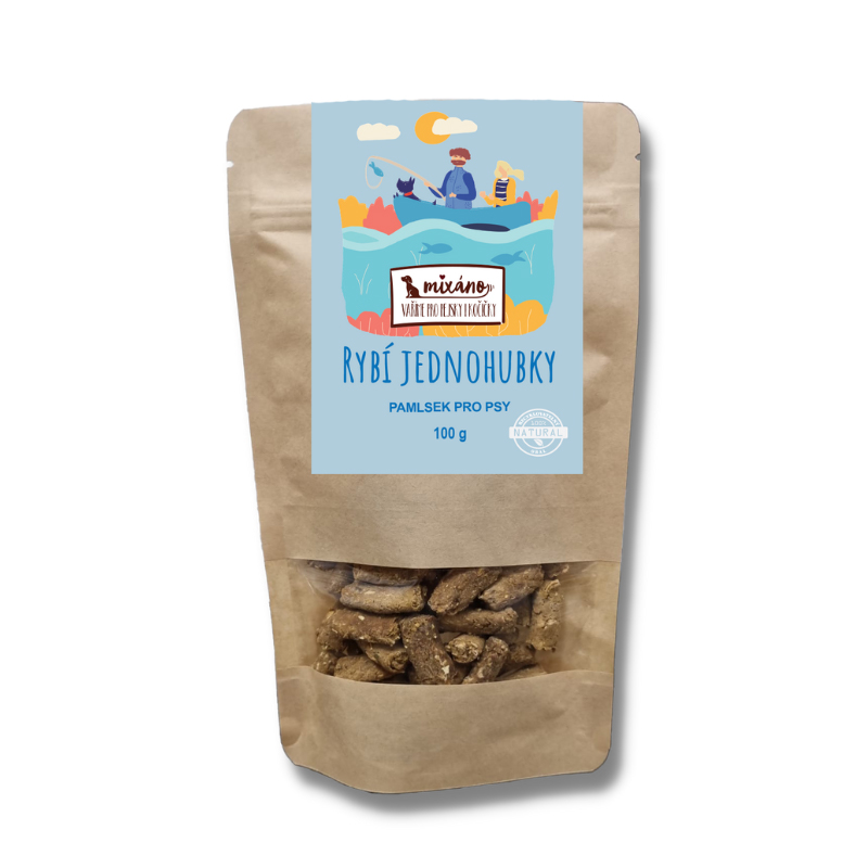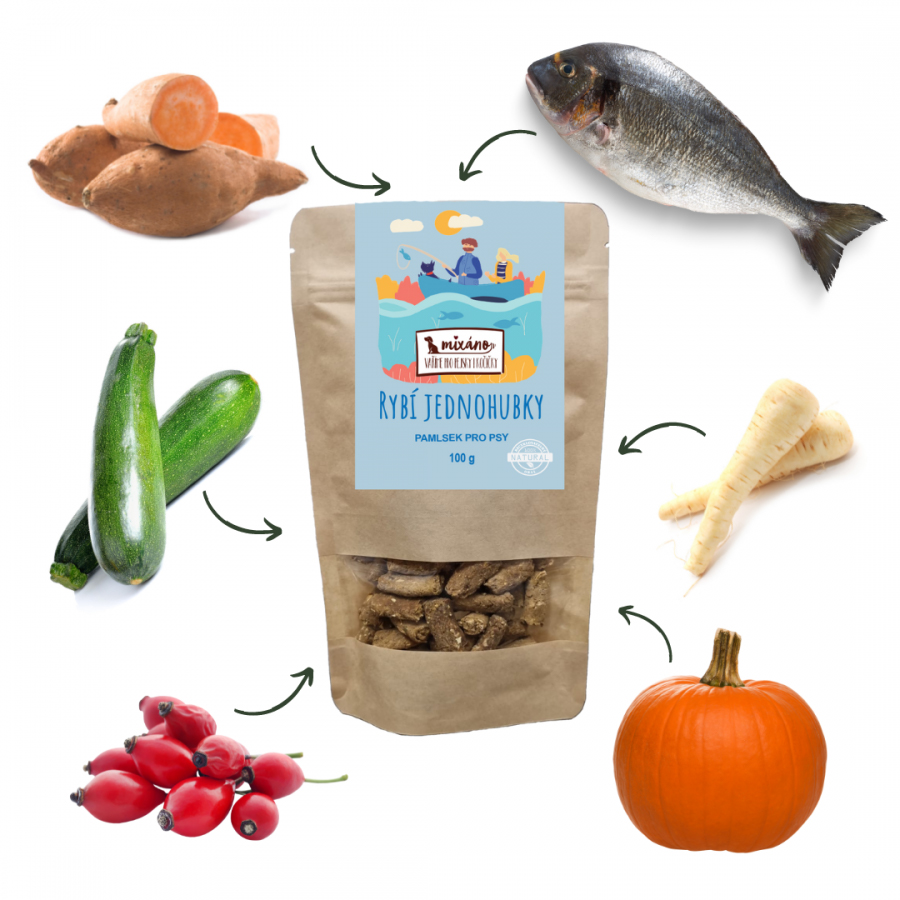 Rybí jednohubky jsou pečené psí pamlsky, které obsahují rybí maso a zeleninu (brambory, sladké brambory, petržel, dýně, cuketa a šípek). Rybí maso obsahuje množství zdravých omega-3 a omega-6 mastných kyselin, které chrání organismus psa před vznikem srdečních a cévních onemocnění. Obsahuje také dostatek vitaminu B6, B12, vitaminu A a D. V rybím mase jsou i minerální látky jako je vápník, fosfor, draslík a jód. Rybí jednohubky obsahují i šípek, který zvířata využívají pro podporu imunitního systému, pro regeneraci a podporu jater, při onemocnění močových orgánů, pro buněčnou regeneraci a hojení. Je to přírodní zdroj vitamínu C. ---