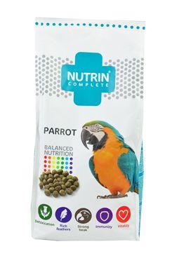 Složení: Kukuřice, pšenice, proso žluté, jablečné výlisky, oves nahý, kvasnice rodu Saccharomyces cerevisiae, hrachový protein, hrách, hrušky, jablka, uhličitan vápenatý, ostropestřec, slunečnicový olej, vejce, spirulina, len, lecitin, sůl, lysin, extrakt z kvasnic, FOS – čekankový inulin 2 g / kg, methionin, echinacea extrakt 1 g / kg, Yucca schidigera 1 g /kg. Analytické složky: Hrubý protein 15 %, hrubé oleje a tuky 5 %, hrubá vláknina 6 %, obsah anorganických látek 5 %, Ca 0,7 %, P 0,4 %. Doplňkové látky / kg: Vitaminy: Vit A (3a672a) 6 000 m.j., vit D3 (E 6713a671) 800 m.j., vit E (3a700) 100 mg, vit C (3a300) 100 mg, biotin (3a880) 200 µg. Stopové prvky: Fe (3b106) 80 mg, Mn (3b506) 70 mg, Zn (3b607) 50 mg, Cu (E4) 8 mg, Se (3b8.11) 0,2 mg. Aminokyseliny: L-lysin (3.2.3.) 3 g, DL-methionin (3c301) 2 g. Emulgátory: Lecitin (E 322) 5 g. Senzorické doplňkové látky: Rozmarýnový extrakt 21 mg. Krmný návod: Krmivo Nutrin Complete Parrot je určeno pro každodenní krmení dospělých papoušků. Vzhledem k tomu, že někteří ptáci jsou velice vybíraví v tom, co jedí, přechod na nové krmivo nemusí být vždycky snadný. Veškeré změny stravy by měly probíhat postupně, s velkým zřetelem na tělesnou hmotnost, spotřebu krmiva, kondici a zdravotní stav jedince. V žádném případě by pták neměl hladovět. Doporučená denní dávka 3 - 5 g na 100 g tělesné hmotnosti by měla představovat zhruba 80 % z celkového denního příjmu potravy, zbývající část poskytuje prostor pro zelené krmení, zeleninu a ovoce. Zajistěte neomezený přístup k čerstvé vodě.