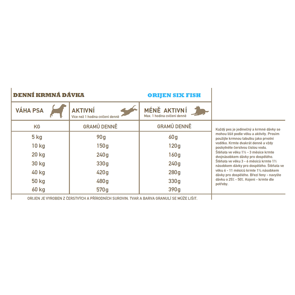 ORIJEN SIX FISH je bezkonkurenční díky svému obsahu ryb lovených v chladných vodách kanadského severního Pacifiku, které jsou nám dodávány čerstvé a celé, takže překypují živinami a skvělou chutí. Připravována exkluzivně v našich vítězně oceňovaných kuchyních NorthStar® zaručí krmiva ORIJEN, že váš pes bude zdravý, spokojený a silný. Je zcela bez obilovin a obsahuje omezené množství sacharidů. Přečtěte si naše složení a myslíme, že budete souhlasit. SLOŽENÍ: Celá syrová sardinka (18%), celá syrová makrela (11%), celý syrový hejk (10%), syrový platýs (6%), celý syrový okouník (6%), celý syrový mořský jazyk (6%), dehydrovaná makrela (5%), dehydrovaný sleď (5%), dehydrovaný síh (5%), dehydrovaná sardinka (5%), dehydrovaná treska modravá (4%), olej ze sledě (4%), celá červená čočka, celý hrách, celá cizrna, celá zelená čočka, vláknina z čočky, celé fazole pinto, hráškový škrob, slunečnicový olej, sušená řasa, celá čerstvá dýně, čerstvá celá máslová dýně, čerstvá celá cuketa, čerstvá celá mrkev, celá čerstvá jablka, čerstvé celé hrušky, sušený kořen čekanky, čerstvá kapusta, čerstvý špenát, čerstvé listy červené řepy, čerstvé listy tuřínu, celé brusinky, celé borůvky, celé plody muchovníku, kurkuma, ostropestřec, kořen lopuchu, levandule, kořen ibišku, šípky. DOPLŇKY (na kg): Extrakt tokoferolu z rostlinných olejů: 121 mg, kyselina citronová: 40 mg, Smyslové doplňky: extrakt z rozmarýnu: 80 mg. Výživové doplňky: 3b606 (Zinku: 75mg), 3b406 (Mědi: 11mg), 3a821 Vitamín B1: 9.8 mg, 3a700 Vitamin E: 200 IU. Zootechnické přidané: 4bl707 Enterococcus faecium NCIMB 1D4151x10A9 CFU. ANALYTICKÉ SLOŽKY: Hrubý protein 38 %, Obsah tuku 18 %, Hrubý popel 8.5 %, Hrubá vláknina 5 %, Vlhkost 12 %, Vápník 1.5 %, Fosfor 1.1 %, Omega-6 mastné kyseliny 2.1 %, Omega-3 mastné kyseliny 2.1 %, DHA/EPA 0.7 % / 0.5 %. OBSAH KALORIÍ (vypočítaný): Vstřebatelná energie je 3880 kcal/kg (466 kcal na odměrku (250ml/120g). Kalorie k podpoře špičkové kondice jsou dodávány: 39 % z bílkovin, 19 % ze sacharidů a 42 % z tuků.