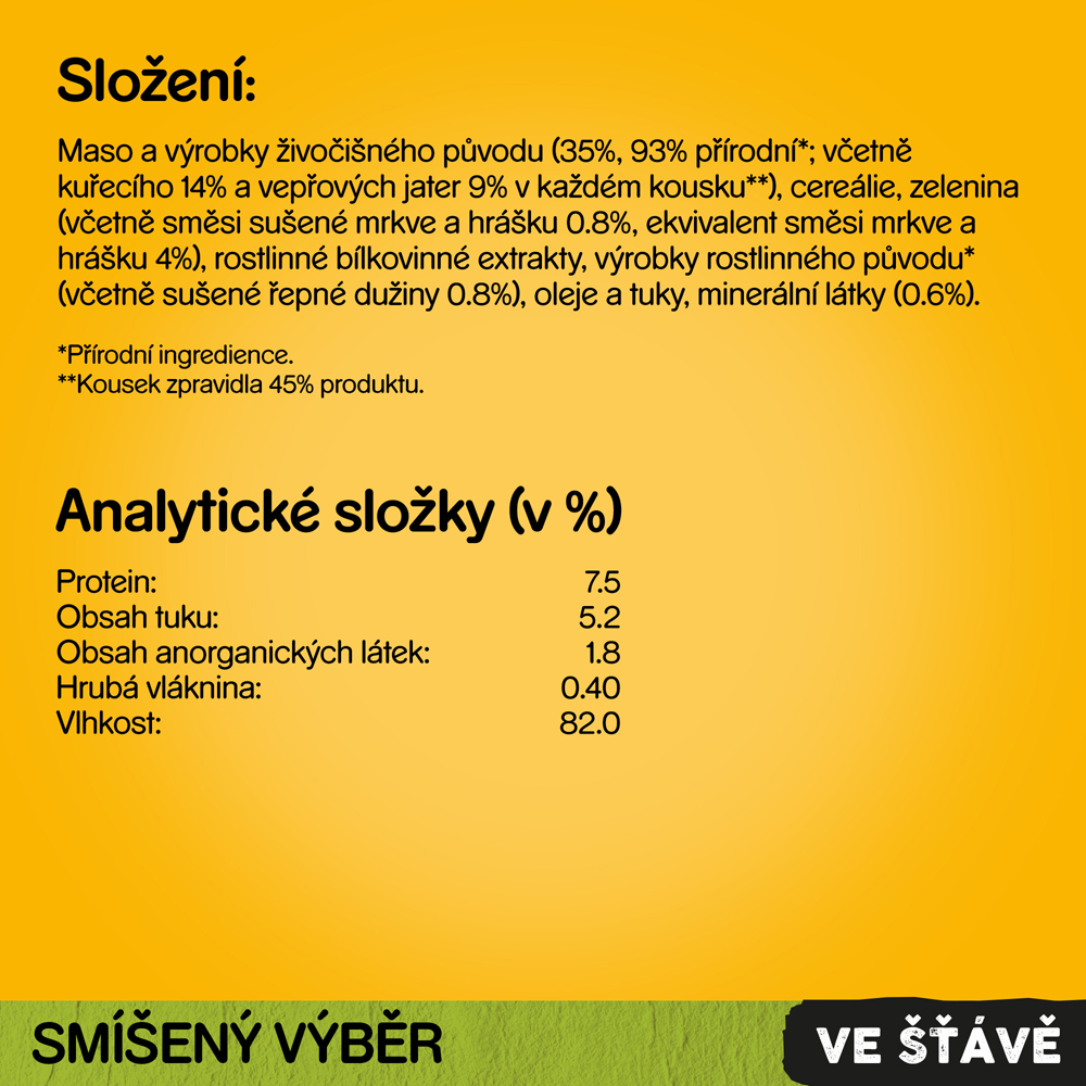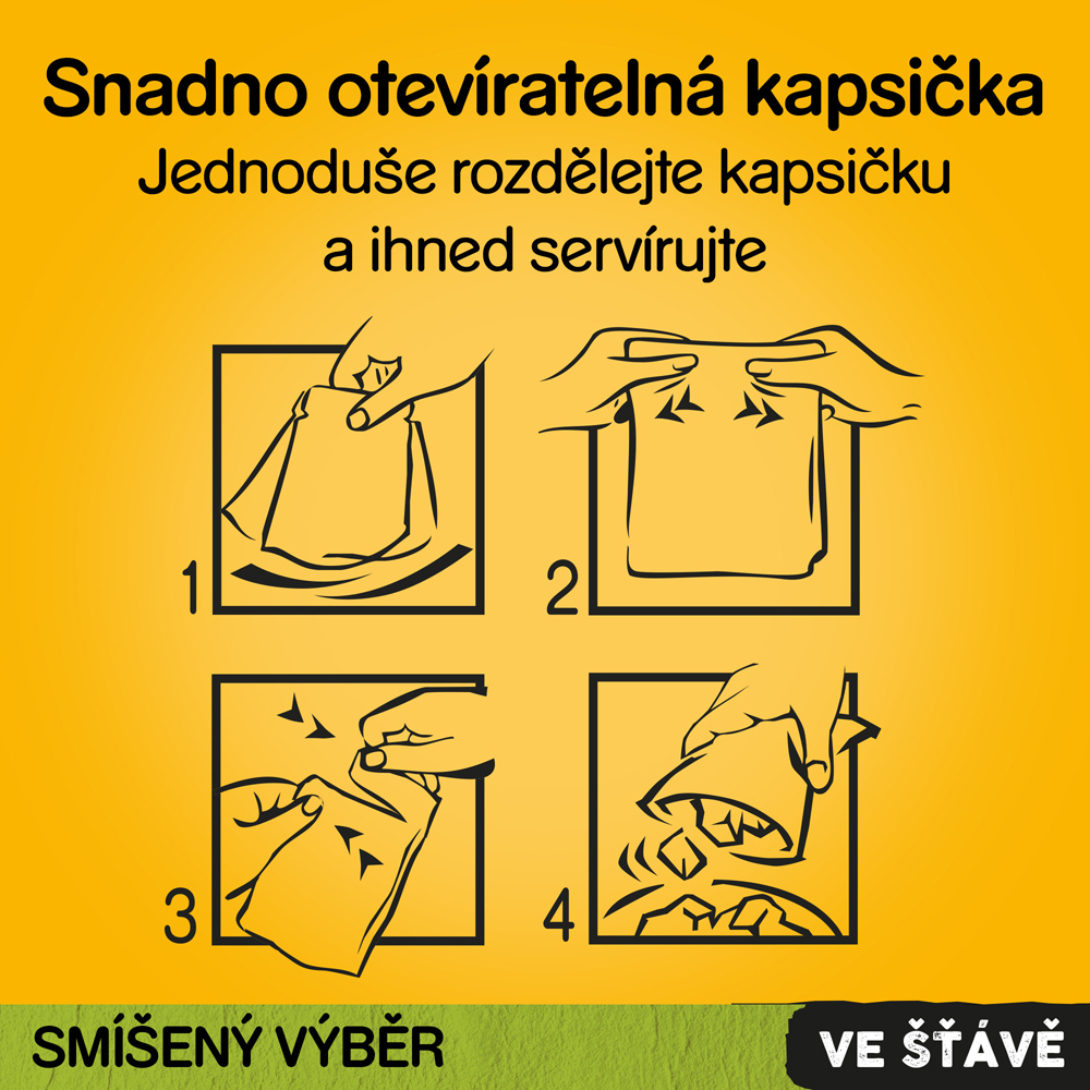Kapsičky Pedigree jsou 100% kompletní a vyvážené, výživné mokré krmivo pro psy. Představují velmi chutnou každodenní potravu, která ve vašem psovi probudí nakažlivé nadšení. V podobě snadno otevíratelných kapsiček představuje ideální porci čerstvého zdravého krmiva. Kapsičky pro psy značky Pedigree, vyvinuté ve spolupráci s veterináři a odborníky na výživu ve Waltham Centru pro výživu domácích zvířat, mají všechny nezbytné živiny podporující optimální trávení, zdravou kůži a srst, přirozenou obranyschopnost organismu a zdravé kosti. Pedigree kapsičky pro psy neobsahují žádná umělá barviva, ochucovadla ani konzervační látky. Doplňkové látky v 1 kg: Nutriční doplňkové látky: Vitamin D3: 200 IU, Vitamin E: 60.0 mg, Měď (Síran měďnatý pentahydrát): 1.7 mg, Jód (Jodičnan vápenatý, bezvodý): 0.28 mg, Železo (Sulfát železa (II), monohydrát): 3.6 mg, Mangan (Sulfát manganu, monohydrát): 2.2 mg, Zinek (Sulfát zinku, monohydrát): 22.7 mg. Analytické složky (v %): protein: 7.5; obsah tuku: 5.2; obsah anorganických látek: 1.8; hrubá vláknina: 0.40; vlhkost: 82.0. 1. 100% kompletní a lahodné mokré krmivo pro dospělé psy. 2. Snadno otevíratelné kapsičky jsou ideální jako čerstvé zdravé krmivo konzumované samostatně nebo jako doplněk k suchému krmivu pro psy. 3. Výživa pro psy, která pomáhá podporovat zdravé kosti, dobré trávení, zdravou kůži a srst a přirozenou obranyschopnost organismu. 4. Krmivo pro psy bylo vyvinuto ve spolupráci s veterináři a odborníky na výživu ve Waltham Centru pro výživu domácích zvířat. 5. Neobsahuje umělá barviva, ochucovadla ani konzervační látky. Pes o hmotnosti 5 kg potřebuje 31 - 4 kapsičky denně, pes o hmotnosti 10 kg potřebuje 61 - 7 kapsiček denně, pes o hmotnosti 20 kg potřebuje 101 - 111 kapsičky denně. Přizpůsobte dávku krmiva věku, velikosti a úrovni aktivity vašeho psa. Jídlo podávejte při pokojové teplotě, nespotřebované porce uchovávejte v chladu po maximální dobu 2 dnů. Složení: maso a výrobky živočišného původu (35%, přírodní^ 93%; včetně kuřecího 14% a vepřových jater 9% v každém kousku), cereálie, zelenina (včetně směsi sušené mrkve a hrášku 0.8%, ekvivalent směsi mrkve a hrášku 4%), rostlinné bílkovinné extrakty, výrobky rostlinného původu^ (včetně sušené řepné dužiny 0.8%), oleje a tuky, minerální látky (0.6%). ^přírodní ingredience. kousek zpravidla 45% produktu. Složení: maso a výrobky živočišného původu (35%, přírodní^ 93%; včetně směs hovězího 6% a vepřových jater 9% v každém kousku), cereálie, zelenina (včetně směsi sušené mrkve a hrášku 0.8%, ekvivalent směsi mrkve a hrášku 4%), rostlinné bílkovinné extrakty, výrobky rostlinného původu^ (včetně sušené řepné dužiny 0.8%), oleje a tuky, minerální látky (0.6%). ^přírodní ingredience. kousek zpravidla 45% produktu. Složení: maso a výrobky živočišného původu (35%, přírodní^ 93%; včetně krůtího 14% a vepřových jater 9% v každém kousku), cereálie, zelenina (včetně sušené mrkve 0.6%, ekvivalent mrkve 4%), rostlinné bílkovinné extrakty, výrobky rostlinného původu^ (včetně sušené řepné dužiny 0.8%), oleje a tuky, minerální látky (0.6%). ^přírodní ingredience. kousek zpravidla 45% produktu. Složení: maso a výrobky živočišného původu (35%, přírodní^ 93%; včetně směsi hovězího 7%, jehněčího 7% a vepřových jater 9% v každém kousku), cereálie, zelenina (včetně sušené mrkve 0.6%, ekvivalent mrkve 4%), rostlinné bílkovinné extrakty, výrobky rostlinného původu^ (včetně sušené řepné dužiny 0.8%), oleje a tuky, minerální látky (0.6%). ^přírodní ingredience. kousek zpravidla 45% produktu.