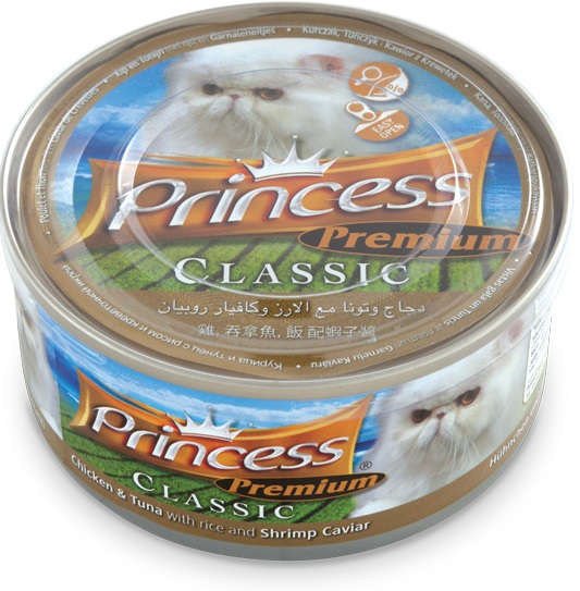 Princess Premium Kuře, tuňák s rýží a kaviárem Složení: 37% tuňák, 16% kuře, 1% kaviár, 1% rýže, 45% rosol (želé, voda, vitamin E). Analytické složení: hrubý protein 11% min, hrubý tuk 0,5% min, hrubá vláknina 1% max, hrubý popel 3% max, vlhkost 85% max.