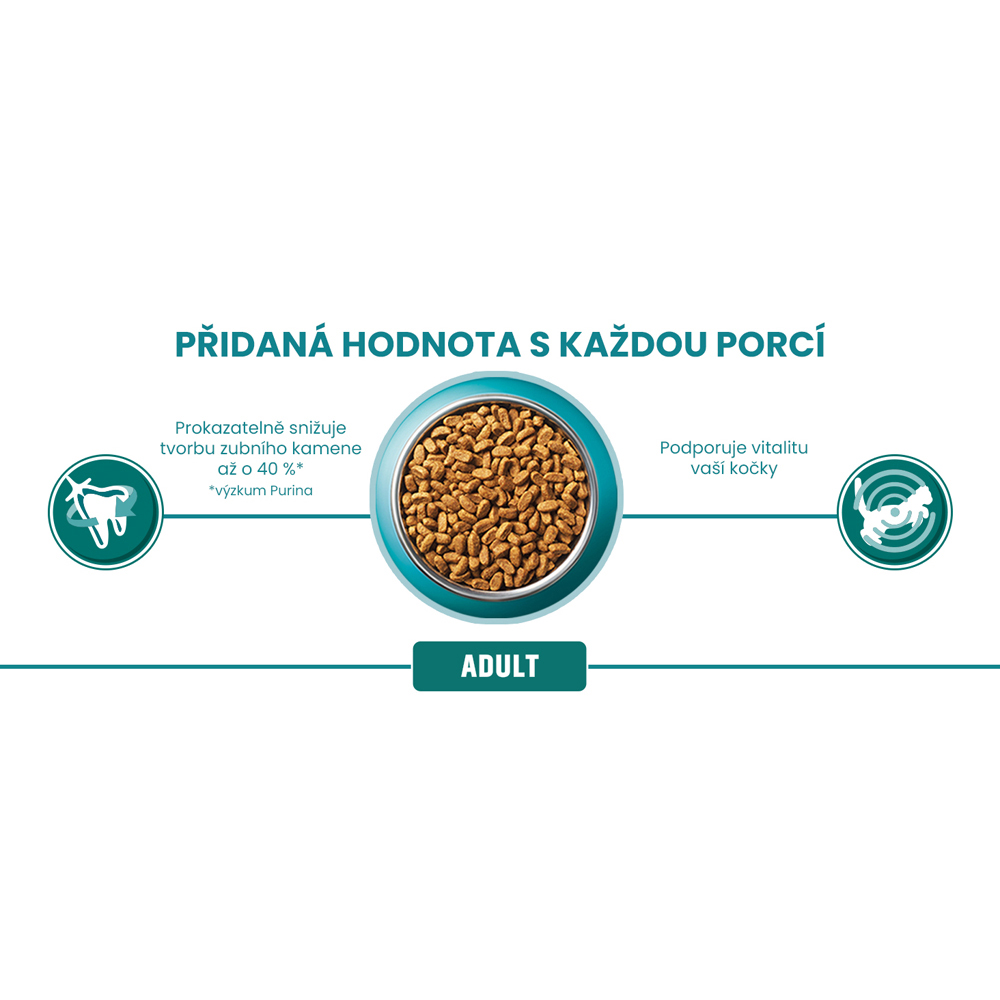 Krmný návod: Doporučená denní krmná dávka (g/den): hmotnost kočky 2-4 kg: 30-60 g, hmotnost kočky 4-6 kg: 60-85 g, hmotnost kočky 6-8 kg: 85-115 g. Objevte také vysoce kvalitní výživu v kapsičkách Purina ONE - lahodné receptury vyvinuté pro specifické potřeby vaší kočky. Doporučené denní krmné dávky by měly být přizpůsobeny klimatickým podmínkám, úrovni aktivity a fyzické kondici kočky. Čistá čerstvá pitná voda by měla být vždy k dispozici. Losos (17 %) (včetně hlavy, skeletu, masa), sušené drůbeží bílkoviny, pšenice (16 %), kukuřice, sójová mouka, pšeničný lepek, živočišné tuky, moučka z kukuřičné bílkoviny, sušený čekankový kořen (2 %), kukuřičná krupice, sušená řepná dužina, minerální látky, dochucovací masové výtažky (s přidanými tepelně ošetřenými bakteriemi Lactobacillus Delbrueckii a Fermentum v prášku 0,025 %), kvasnice. Doplňkové látky: Nutriční doplňkové látky:, m.j./kg:, vit A:: 1320, vit D3:: 185, vit E:: 200, mg/kg:, 3b103:: (Fe: 16), 3b202:: (I: 0,47), 3b405:: (Cu: 1,2), 3b503:: (Mn: 2,2), 3b605:: (Zn: 23), 3a370:: 600, Zchutňující látky. Analytické složky:, vlhkost:: 77,5 %, protein:: 13,5 %, obsah tuku:: 2,8 %, obsah anorganických látek:: 2,6 %, hrubá vláknina:: 0,8 %.