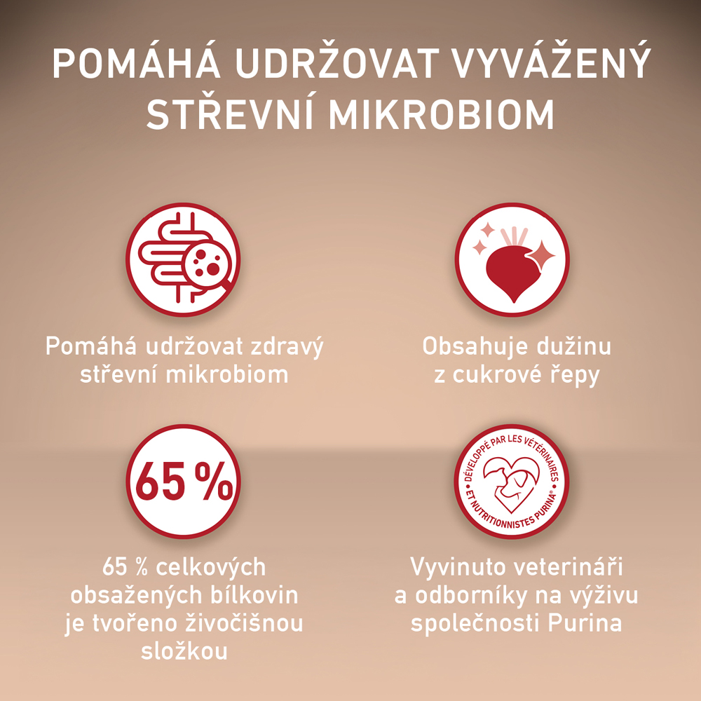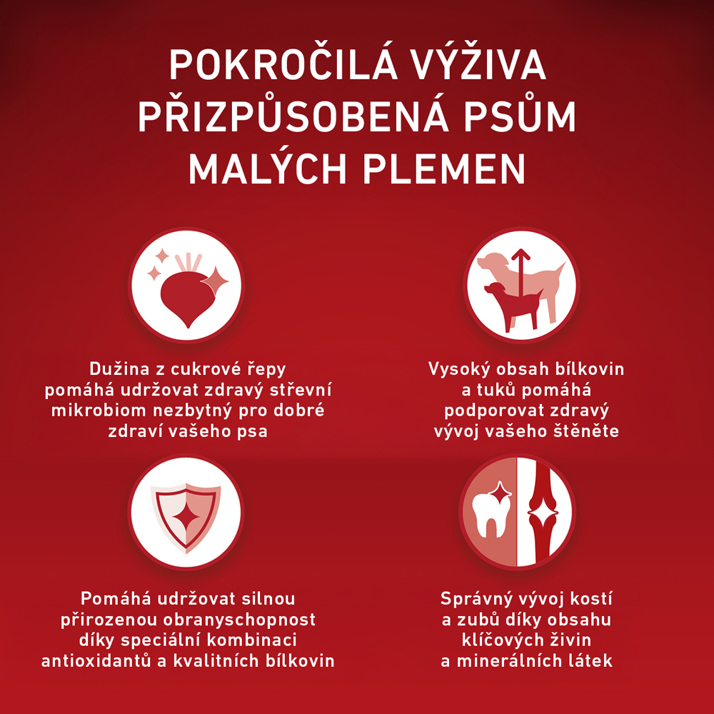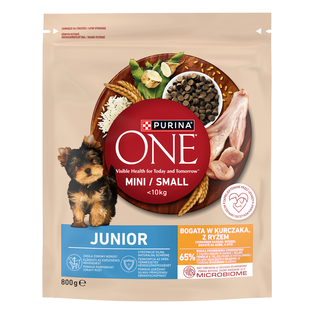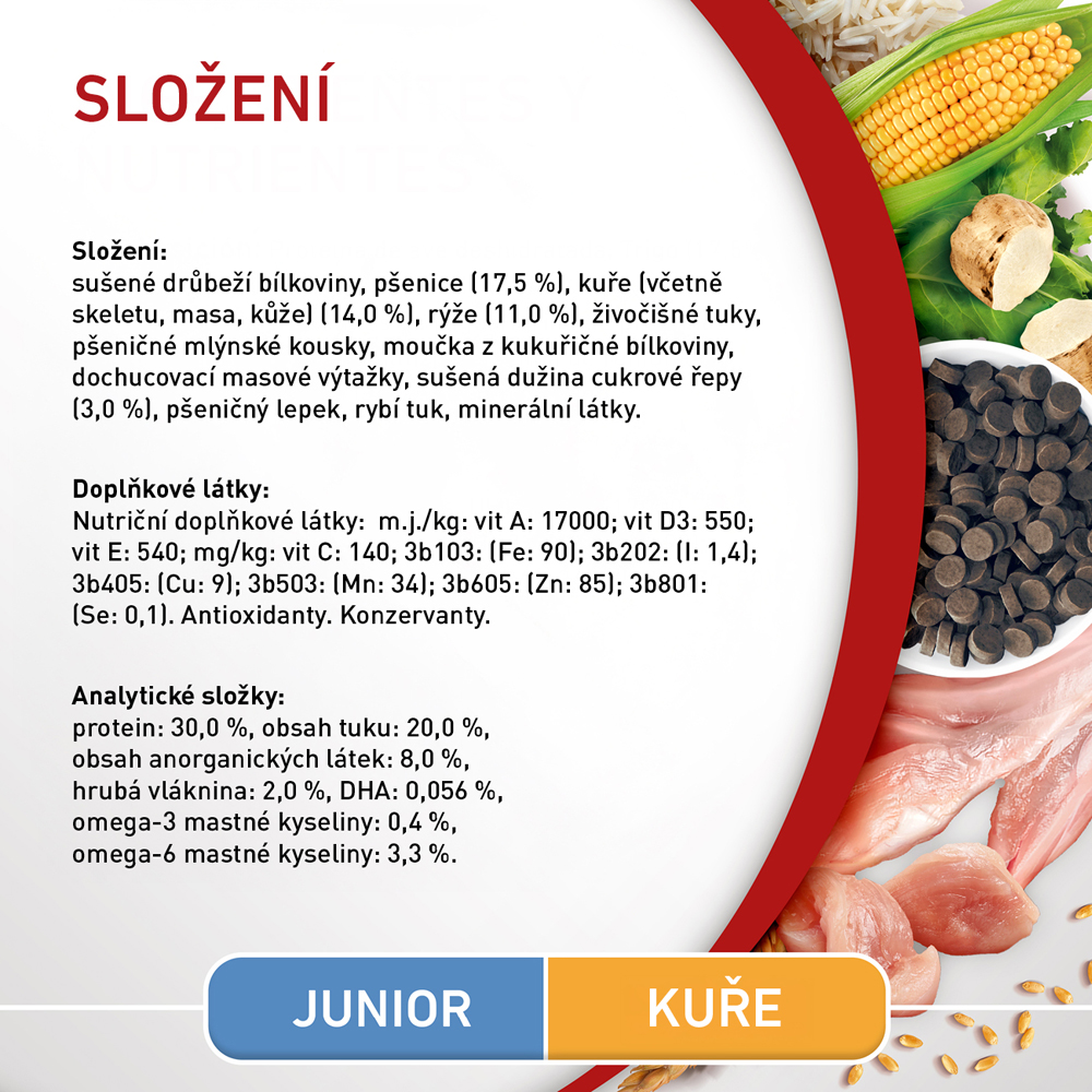 PURINA ONE® MINI/SMALL < 10 kg Junior je chutná receptura bohatá na kuře s vysokým podílem bílkovin, které pomáhají podporovat zdravý růst vašeho štěněte od 1 do 12 měsíců. Obsahuje vysoce kvalitní suroviny, které napomáhají udržet přirozenou obranyschopnost organismu a silné zuby a kosti. 65 % celkových obsažených bílkovin je tvořeno živočišnou složkou. Dužina cukrové řepy pomáhá udržovat zdravý střevní mikrobiom nezbytný pro dobré zdraví vašeho psa. Bez přidaných barviv, bez přidaných umělých konzervantů. Vysoký obsah bílkovin a tuků podporuje zdravý a rychlý vývoj vašeho štěněte. Pomáhá udržovat silnou přirozenou obranyschopnost díky speciální kombinaci antioxidantů a kvalitních bílkovin. Správný vývoj kostí a zubů díky obsahu klíčových živin a minerálních látek. Pomáhá při vývoji mozku a zraku štěněte díky DHA mastné kyselině, která se vyskytuje také v mateřském mléce. Složení: Sušené drůbeží bílkoviny, pšenice (17,5 %), kuře (včetně skeletu, masa, kůže) (14,0 %), rýže (11,0 %), živočišné tuky, pšeničné mlýnské kousky, moučka z kukuřičné bílkoviny, dochucovací masové výtažky, sušená dužina cukrové řepy (3,0 %), pšeničný lepek, rybí tuk, minerální látky Doplňkové látky: Nutriční doplňkové látky:: m.j./kg:, vitamín A:: 17000, vitamín D3:: 550, vitamín E:: 540, mg/kg:, vit C:: 140, síran železnatý monohydrát: (Fe:): 90, jodičnan vápenatý bezvodý: (I:): 1,4, síran měďnatý pentahydrát: (Cu:): 9, síran manganatý monohydrát: (Mn:): 34, síran zinečnatý monohydrát: (Zn:): 80, seleničitan sodný: (Se:): 0,1, Antioxidanty, Analytické složky: protein:: 30,0 %, obsah tuku:: 20,0 %, obsah anorganických látek:: 8,0 %, hrubá vláknina:: 2,0 %, DHA:: 0,056 %, omega-3 mastné kyseliny:: 0,4 %, omega-6 mastné kyseliny:: 3,3 %