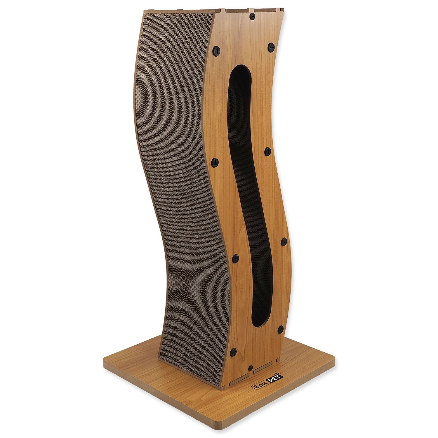 Designové škrabadlo pro kočky s dřevěnou konstrukcí a možností výměny kartonových částí. Škrabadlo svým vzhledem doplní jakýkoli moderní styl domácnosti. Je vyrobené z odolné vlnité lepenky, která je vhodným materiálem pro obrušování kočičích drápků. Uvnitř konstrukce je umístěná hračka pro větší atraktivitu škrabadla. Po opotřebení je u tohoto škrabadla možnost výměny kartonových částí. Součástí balení je sáček se šantou kočičí, který se může vsypat do kartonu. Šanta kočku snadno naláká ke hře. V balení jsou také plstěné protiskluzové podložky, které můžete přilepit na spodní stranu škrabadla a chránit tak podlahu proti poškrábání. K sestavení Vám pomůže manuál, který najdete v balení. S rozměry 30 x 30 x 61 cm je vhodné pro všechny kočky. Upozornění Při používání dochází k uvolňování drobných papírových částic. Pro zajištění bezpečnosti Vaší kočky na ni dohlížejte po celou dobu hraní. Škrabadlo je určené pouze pro zvířata, nepoužívejte k jiným účelům. Zamezte kontaktu s vodou.