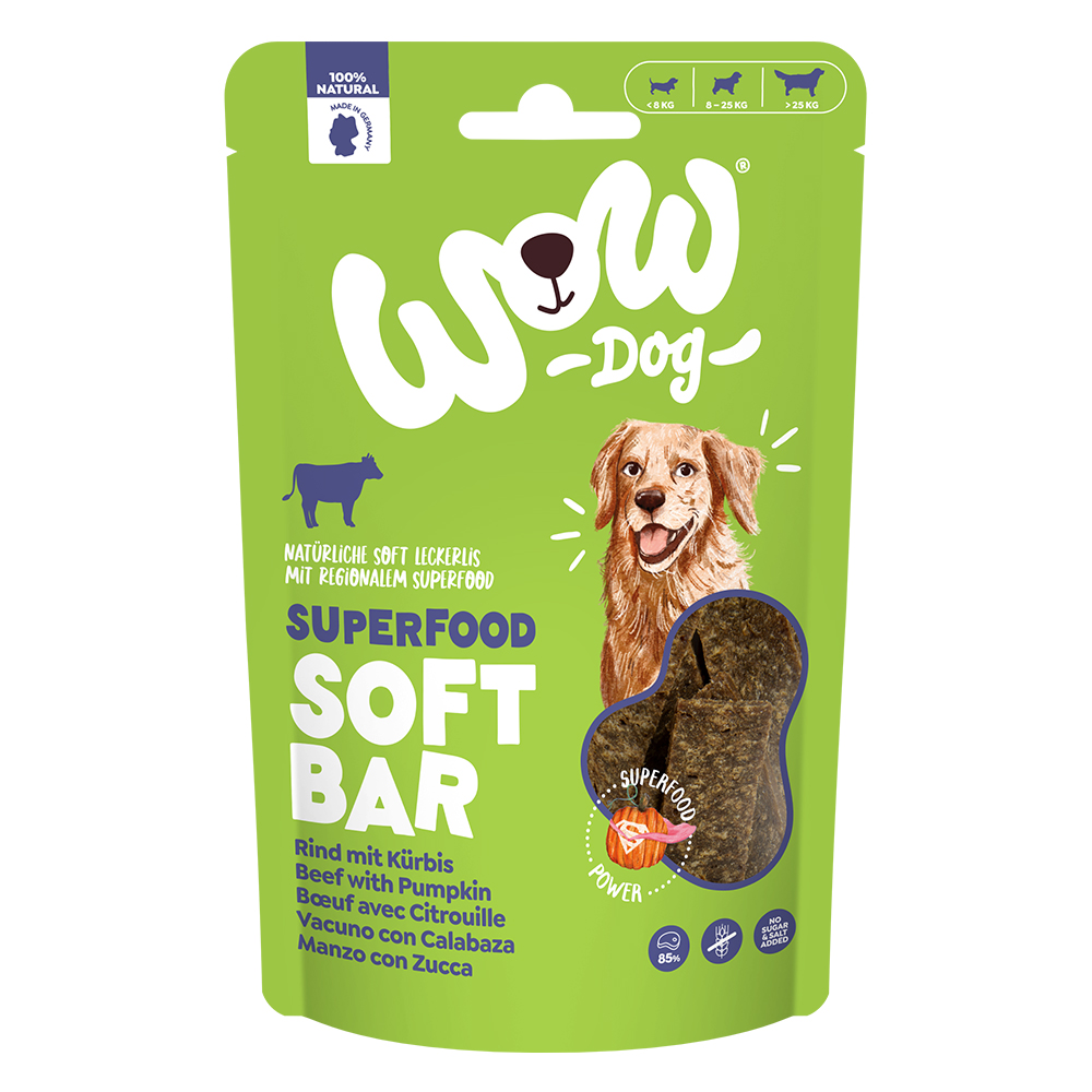 Měkké proužky z hovězí svaloviny s dýní. Skvělá a zdravá přírodní odměna za trénink nebo poslušnost potěší každého psíka, který miluje hovězí maso. Vhodné také jako svačinka na cesty. Monoproteinové složení bez obilovin, lepku a dochucovadel je vhodné také pro citlivé psy a alergiky. Šikovné balení v uzavíratelném sáčku zajistí, že pamlsky zůstanou stále měkké a voňavé. Hodí se také do plnících hraček nebo čmuchacích koberečků, podle potřeby lehce odlomíte menší kousky nebo použijete celý proužek. Výhody WOW Dog Hovězích proužků s dýní: - chutné přírodní žvýkačky - snadno stravitelné - ideální pro péči o zuby - měkké a lehce odlomitelné na požadovanou velikost - vhodné do hraček a čmuchacích koberečků (nedrobí) - monoprotienové složení (jeden druh bílkoviny) - bez obilovin, přidaného cukru nebo zvýrazňovačů chuti Složení: 85% hovězí maso, 10% dýně, 5% rostlinný glycerin Energie: 1550 kJ, 371 kcal /100g (2-5ks/24h) Analytické složky: Hrubý protein 45,2%, hrubý tuk 14,5%, hrubý popel 5,5%, hrubá vláknina 1,9%, vlhkost 14,3%. Neobsahuje: Obiloviny, lepek, přidaný cukr, sůl, dochucovadla, zvýrazňovače chuti, aromata. Datum spotřeby na obalu. Balení: 150g Použití: Podávejte jako doplňkové krmivo. Pes by měl mít vždy přístup k čerstvé vodě, podávejte při pokojové teplotě. Uchovávejte v suchu. Výrobce: WOW Dog (vyrobeno v Rakousku) Oficiální dovozce a distributor pro ČR: Rebel Dog s.r.o. Poslední aktualizace: 2025/08